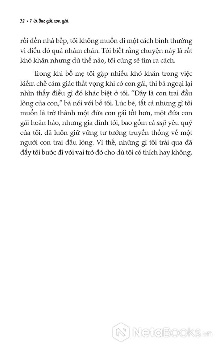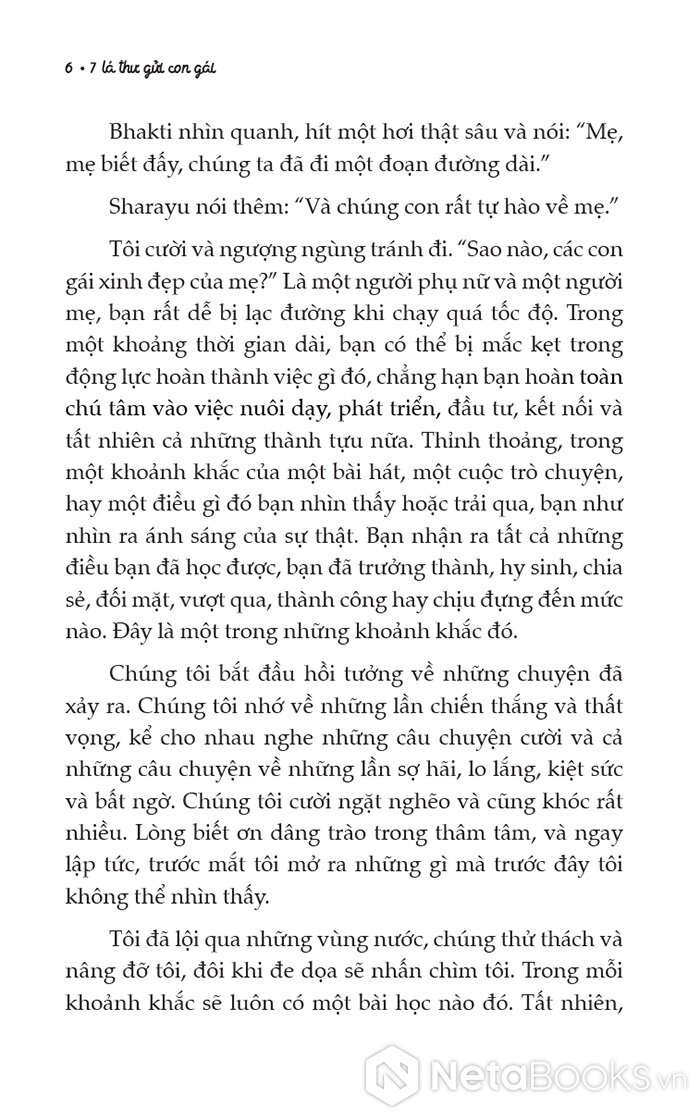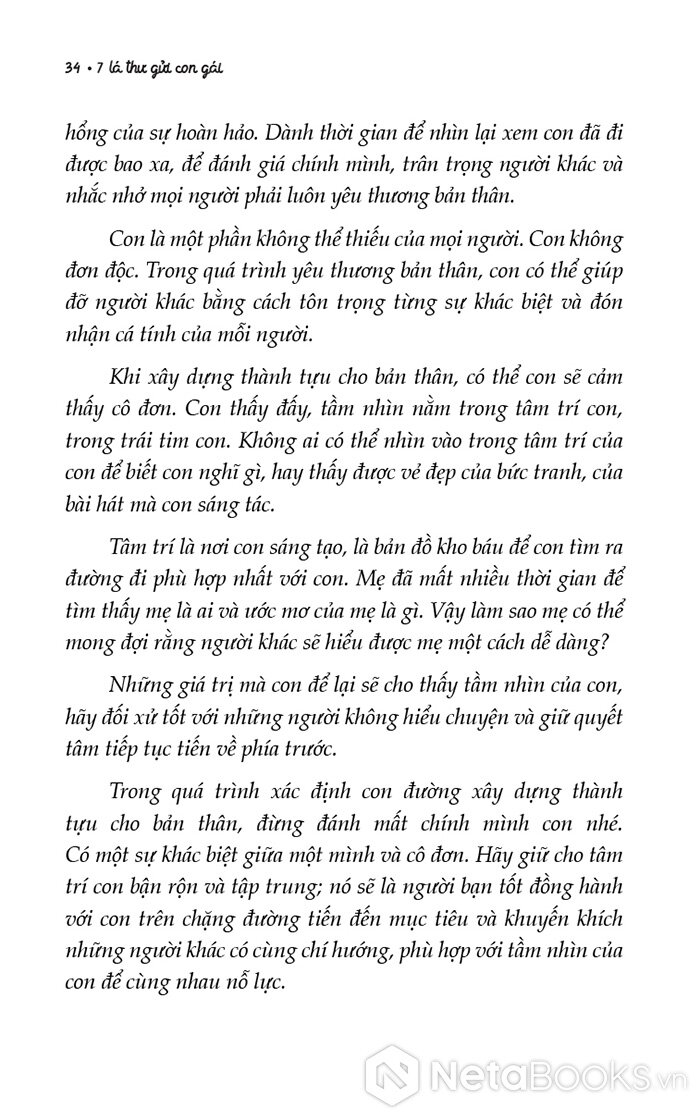 340 Trang sách 7 Lá thư gửi con gái: Bài học về tình yêu thương, tinh thần lãnh đạo và gia tài để lại là những bức thư tình sâu sắc, lắng đọng và cũng là món quà trưởng thành của mẹ dành tặng con gái, mong con chân cứng đá mềm, mong con có thể vui vẻ, bình an cả đời. Bởi không có điểm tựa nào vững chắc hơn giá trị của chính bản thân mình và hãy vin vào việc có mặt trên đời là ý của trời để đứng dậy đi tiếp. Mong rằng bạn hãy đọc những câu chuyện này với một tâm thế tích cực, bởi vì đó là cách mà tác giả, trong khả năng tốt nhất của mình, đã chịu đựng và vượt qua tất cả, tiếp tục tiến về phía trước.