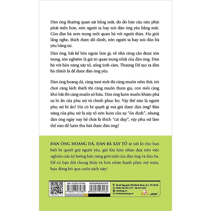 Đàn ông hoang dã, đàn bà xây tổ sẽ tiết lộ cho bạn biết bí quyết giữ người yêu, giữ lửa hôn nhân dựa trên việc nghiên cứu kỹ lưỡng bản năng giới tính của đàn ông và đàn bà. Để có bạn đời chung thủy và hôn nhân hạnh phúc mỹ mãn, bạn đừng bỏ qua cuốn sách này!