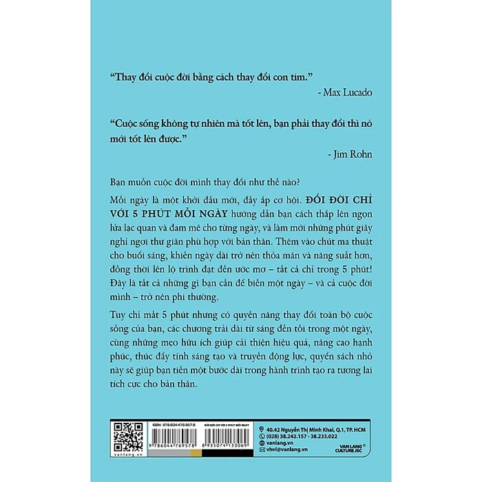Mỗi ngày là một khởi đầu mới, đầy ắp cơ hội. ĐỔI ĐỜI CHỈ VỚI 5 PHÚT MỖI NGÀY hướng dẫn bạn cách thắp lên ngọn lửa lạc quan và đam mê cho từng ngày, và làm mới những phút giây nghỉ ngơi thư giãn phù hợp với bản thân. Thêm vào chút ma thuật cho buổi sáng, khiến ngày dài trở nên thỏa mãn và năng suất hơn, đồng thời lên lộ trình đạt đến ước mơ - tất cả chỉ trong 5 phút! Đây là tất cả những gì bạn cần để biến một ngày - và cả cuộc đời mình - trở nên phi thường.