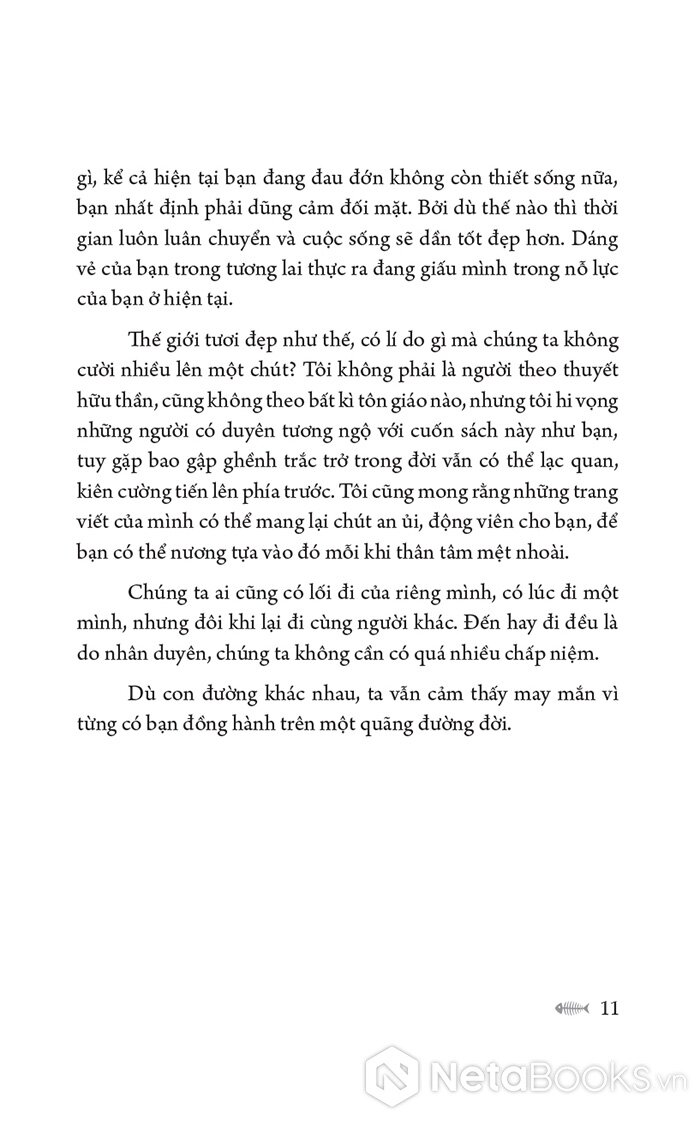 "Thế giới tươi đẹp như thế, có lí do gì mà chúng ta không cười nhiều lên một chút? Tôi không phải là người theo thuyết hữu thần, cũng không theo bất kì tôn giáo nào, nhưng tôi hi vọng những người có duyên tương ngộ với cuốn sách này như bạn, tuy gặp bao gập ghềnh trắc trở trong đời vẫn có thể lạc quan, kiên cường tiến lên phía trước. Tôi cũng mong rằng những trang viết của mình có thể mang lại chút an ủi, động viên bạn, để bạn có thể nương tựa vào đó mỗi khi thân tâm mệt nhoài."