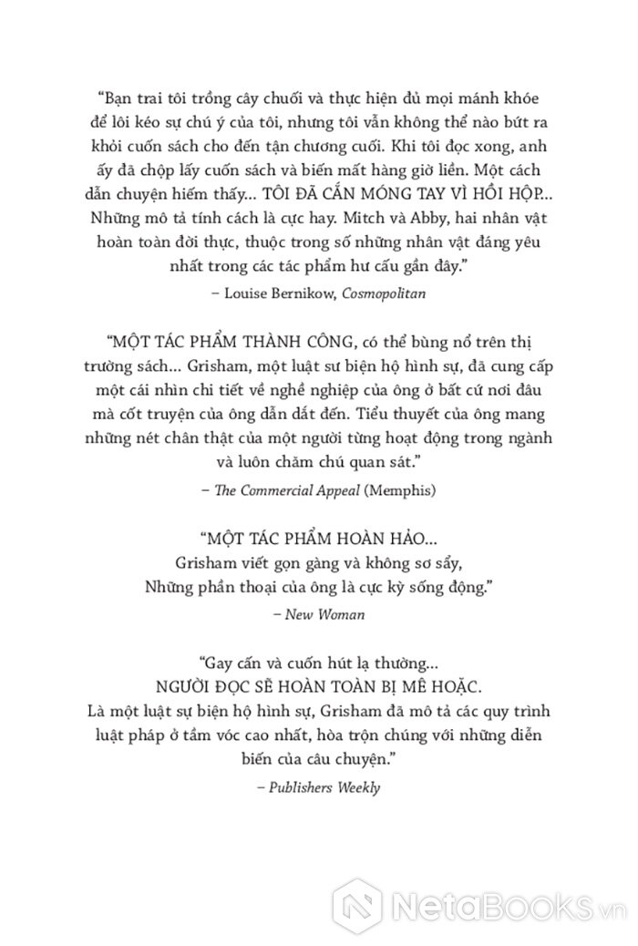 “Gay cấn và cuốn hút lạ thường… NGƯỜI ĐỌC SẼ HOÀN TOÀN BỊ MÊ HOẶC BỞI CUỐN SÁCH NÀY. Là một luật sự biện hộ hình sự, Grisham đã mô tả các quy trình luật pháp ở tầm vóc cao nhất, hòa trộn chúng với những diễn biến của câu chuyện.” - Publishers Weekly