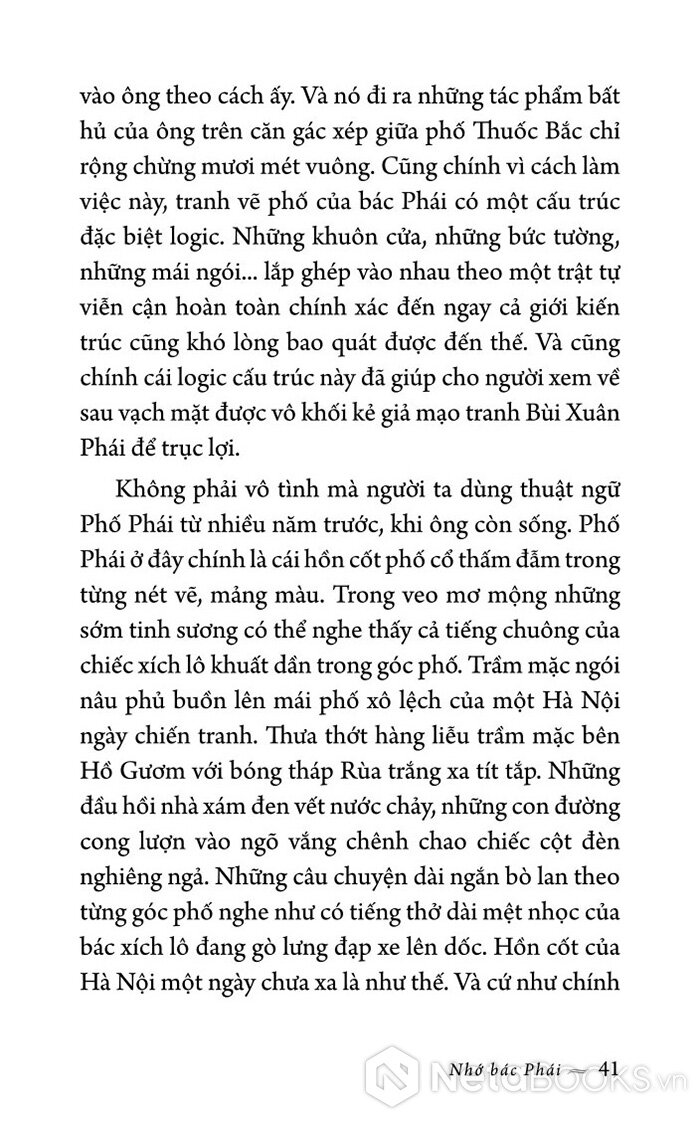 Chuyện Hà Nội, lan man nghìn năm phố vẫn kể chưa hết... Tản văn Đỗ Phấn là một cuộc khảo cứu ký ức của chính mình. Chân xác, tỉ mỉ nhưng không vì thế mà nặng gánh theo một cứu cánh. Lấy cái giọng kể vừa phải chậm rãi đặc trưng làm nhịp, tác bình thản gửi gắm chút nhớ thương cho ngày cũ. Ký ức ở đây luôn hòa lẫn với những ám ảnh, suy tư thường ngày chất đầy Hà Nội. Như chút bụi phố còn vương trên vai áo người, đó là một thứ ký ức nhẹ tênh giữa những nặng nề tiện nghi của đổi thay, một thứ ký ức lịch lãm của-hiện-tại và cho-hiện-tại. Không vui.