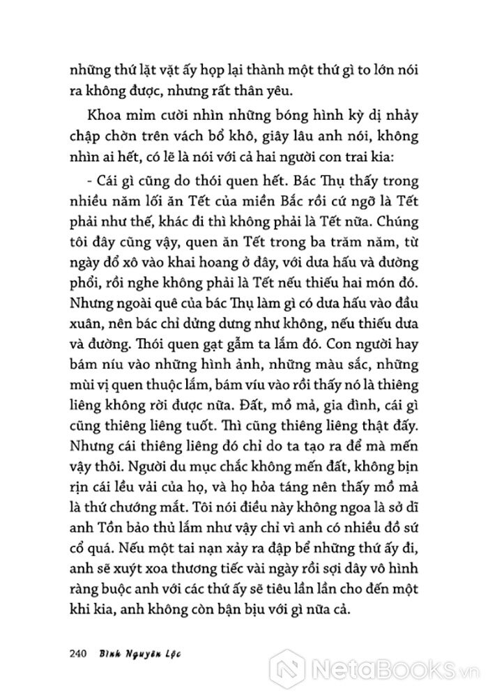 Hay truyện "Quyển gia phổ", trong cái lung linh của ngôn từ tinh lọc, hàm súc và nhiều tầng nghĩa, tác giả đưa người đọc dõi theo một nhóm bạn cùng đàm đạo chuyện nhân tình thế thái trong một đêm cuối năm: Những khác biệt trong quan niệm tồn giữ các giá trị xưa cũ, hay sự mâu thuẫn giữa nỗi mặc cảm và niềm kiêu hãnh đã được đẩy lên cao trào khi ngọn lửa ngùn ngụt bốc cháy trên ban thờ tổ tiên trong sự tuyệt vọng bất lực của gia chủ - quyển gia phổ, bảo vật của gia đình đã trở thành đống tro tàn.
