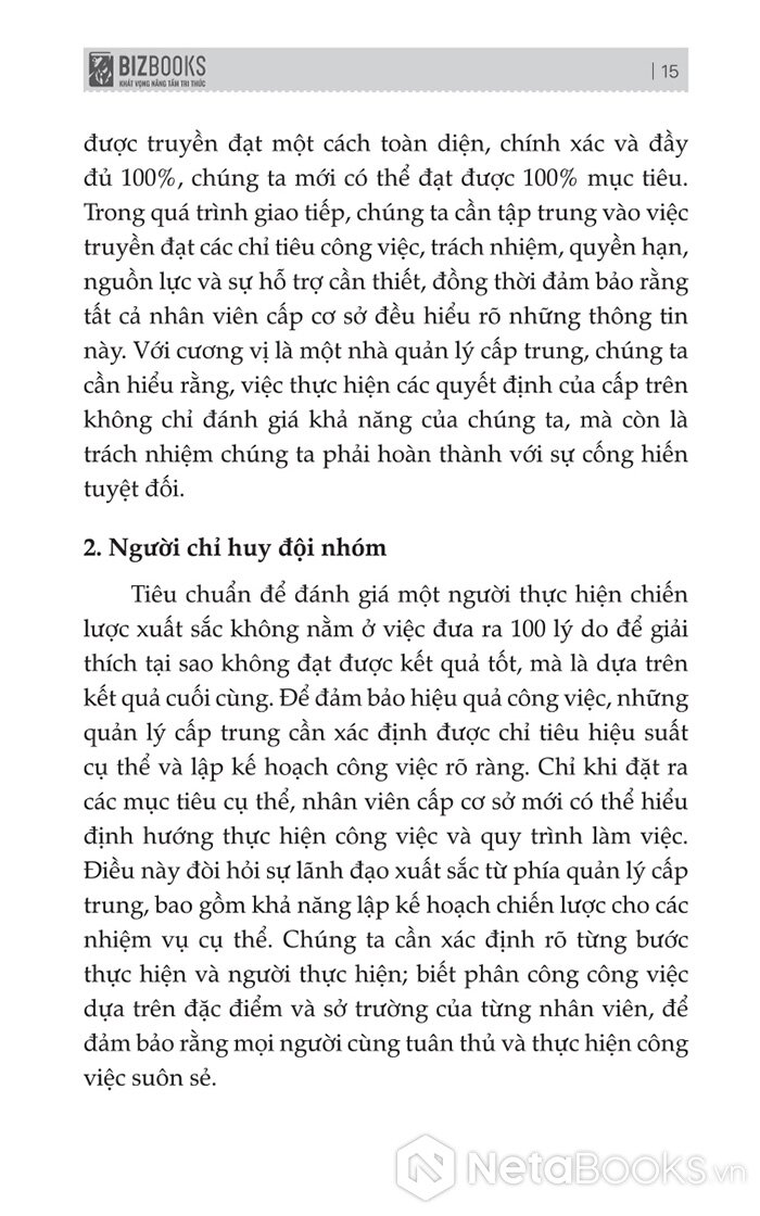 Để đạt được điều này, các nhà quản lý cấp trung cần tham gia vào quá trình chuyển đổi kế hoạch thành hành động và biến hành động thành kết quả. Cuốn sách đưa ra tất cả mọi thứ mà các nhà quản lý cấp trung cần nắm rõ khi đứng ở vị trí trung gian, cung cấp tất cả những phương pháp, công cụ và tiêu chuẩn toàn diện để hướng dẫn đội ngũ quản lý.