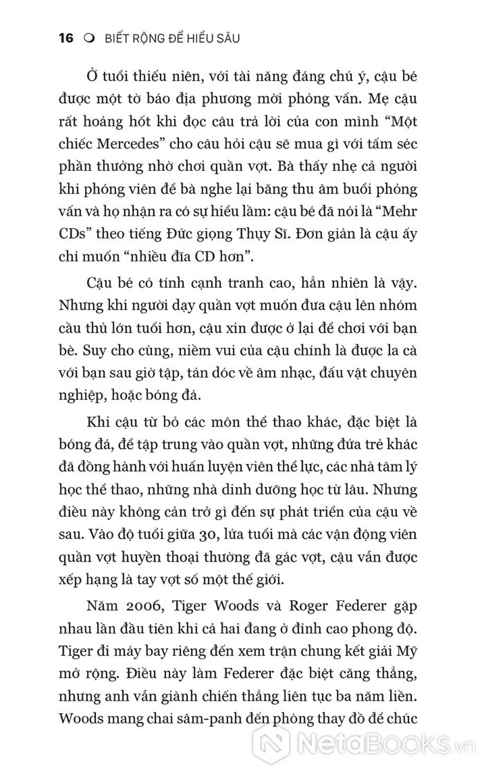 Tuy không phủ nhận việc bồi dưỡng năng khiếu và đào tạo chuyên sâu từ sớm đối với một số lĩnh vực là cần thiết (như trường hợp của gôn thủ số 1 thế giới Tiger Woods), nhưng David Epstein cũng khiên độc giả phải suy ngẫm về con đường thành công của vận động viên quần vợt Roger Federer. Trong khi Tiger tham gia vào quá trình “luyện tập có chủ đích”, với nguyên tắc 10.000 giờ nghiêm ngặt ngay từ thuở nhỏ, thì Roger lại khởi đầu với nhiều lĩnh vực, đón nhận nhiều trải nghiệm trong quá trình phát triển, nhưng sau này anh vẫn trở thành tay vợt vĩ đại. Hay như câu chuyện về danh họa Van Gogh. Chỉ thực sự bước vào hội họa lúc đã 27 tuổi, sau khi lăn lộn các dạng công việc khác nhau, nhưng Van Gogh lại là một trong những họa sĩ ảnh hưởng lớn tới lịch sử nghệ thuật phương Tây với nhiều bức tranh giá trị nhất thế giới.