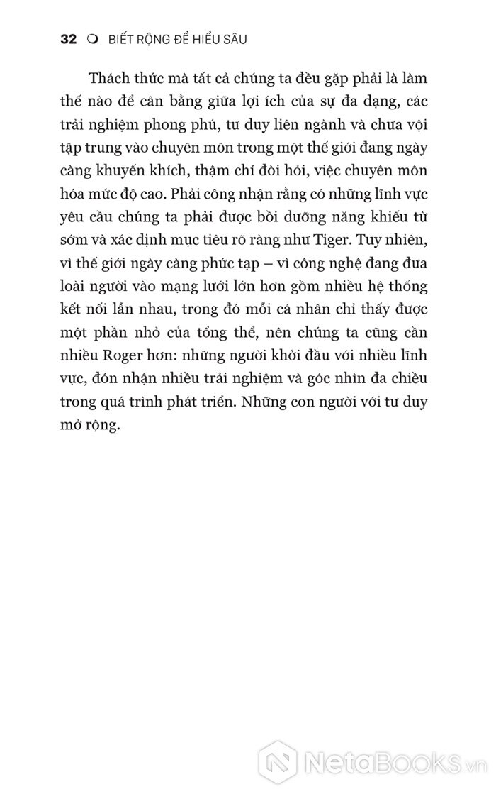 “Trong một thế giới ngày càng bị ảnh hưởng về chuyên môn hóa, tác giả khoa học xuất sắc David Epstein đã thuyết phục bạn rằng tương lai có thể thuộc về những người có hiểu biết rộng về nhiều lĩnh vực. Đây là một cuốn sách hấp dẫn và sau khi khép lại trang cuối cùng, bạn sẽ trăn trở về bước đi tiếp theo trong sự nghiệp cũng như cách nuôi dạy con cái.” - Adam Grant, tác giả sách Give and Take, Originals.