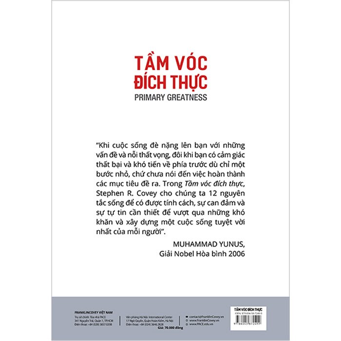 “Khi cuộc sống đè nặng lên bạn với những vấn đề và nỗi thất vọng, đôi khi bạn có cảm giá thất bại và khó tiến về phía trước dù chỉ một bước nhỏ, chứ chưa nói đến việc hoàn thành các mục tiêu đề ra. Trong cuốn “Tầm vóc đích thực”, Stephen R.Covey cho chúng ta 12 nguyên tắc sống để có được tính cách, sự can đảm và sự tự tin cần thiết để vượt qua những khó khăn và xây dựng một cuộc sống tuyệt vời nhất của mỗi người.” – Muhammad Yunus, Giải Nobel Hòa Bình 2006