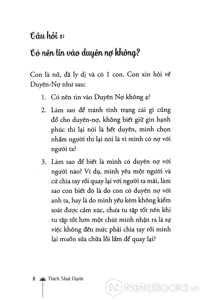 Nếu mình không thay đổi những tập khí của mình thì cho dù có cưới bao nhiêu người đi nữa mình cũng khổ đau. Vì vậy, cùng với sự thực tập, mình luôn luôn trở về với giây phút hiện tại, nhận diện và trân quý những gì mình đang có để nuôi lớn hạnh phúc, và đồng thời chuyển hóa những tập khí trong mình.