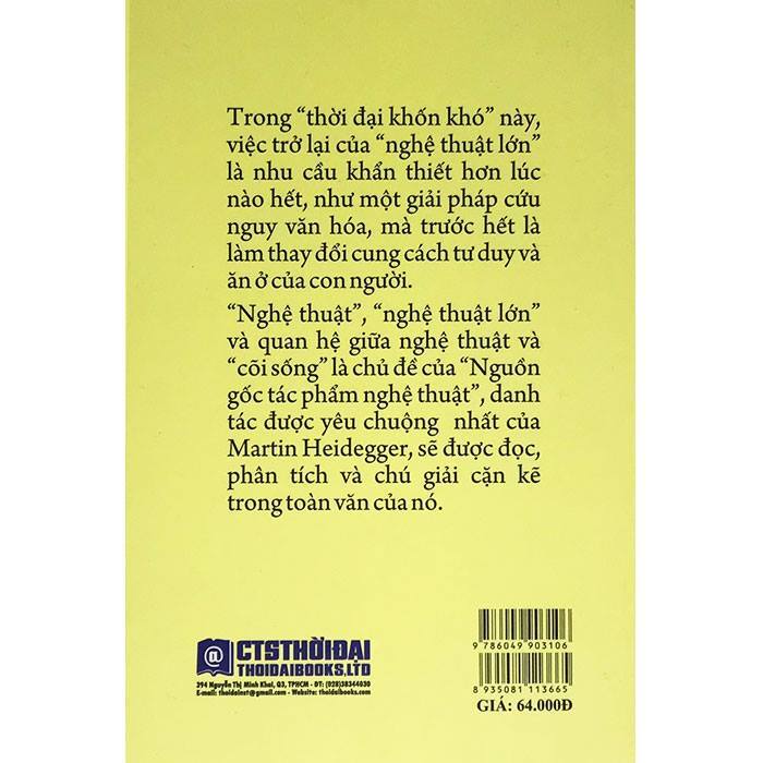 Trong “thời đại khốn khó” này, việc trở lại của “nghệ thuật lớn” là nhu cầu khẩn thiết hơn lúc nào hết, như một giải pháp cứu nguy văn hóa, mà trước hết là làm thay đổi cung cách tư duy và ăn ở của con người. “Nghệ thuật”, “nghệ thuật lớn” và quan hệ giữa nghệ thuật và “cõi sống” là chủ đề của “Nguồn gốc tác phẩm nghệ thuật”, danh tác được yêu chuộng nhất của Martin Heidegger, sẽ được đọc, phân tích và chú giải cặn kẽ trong toàn văn của nó.